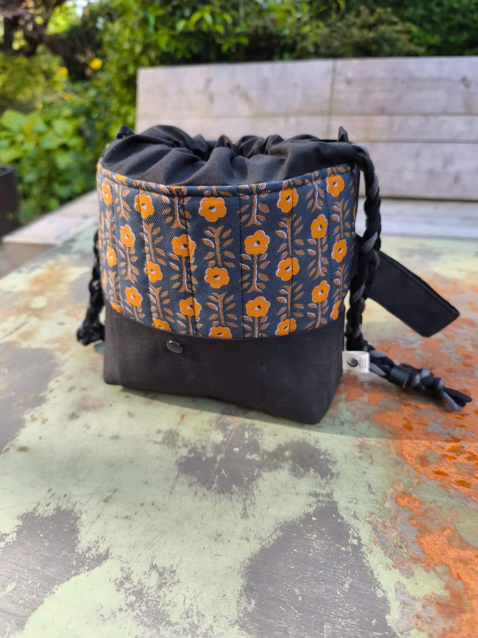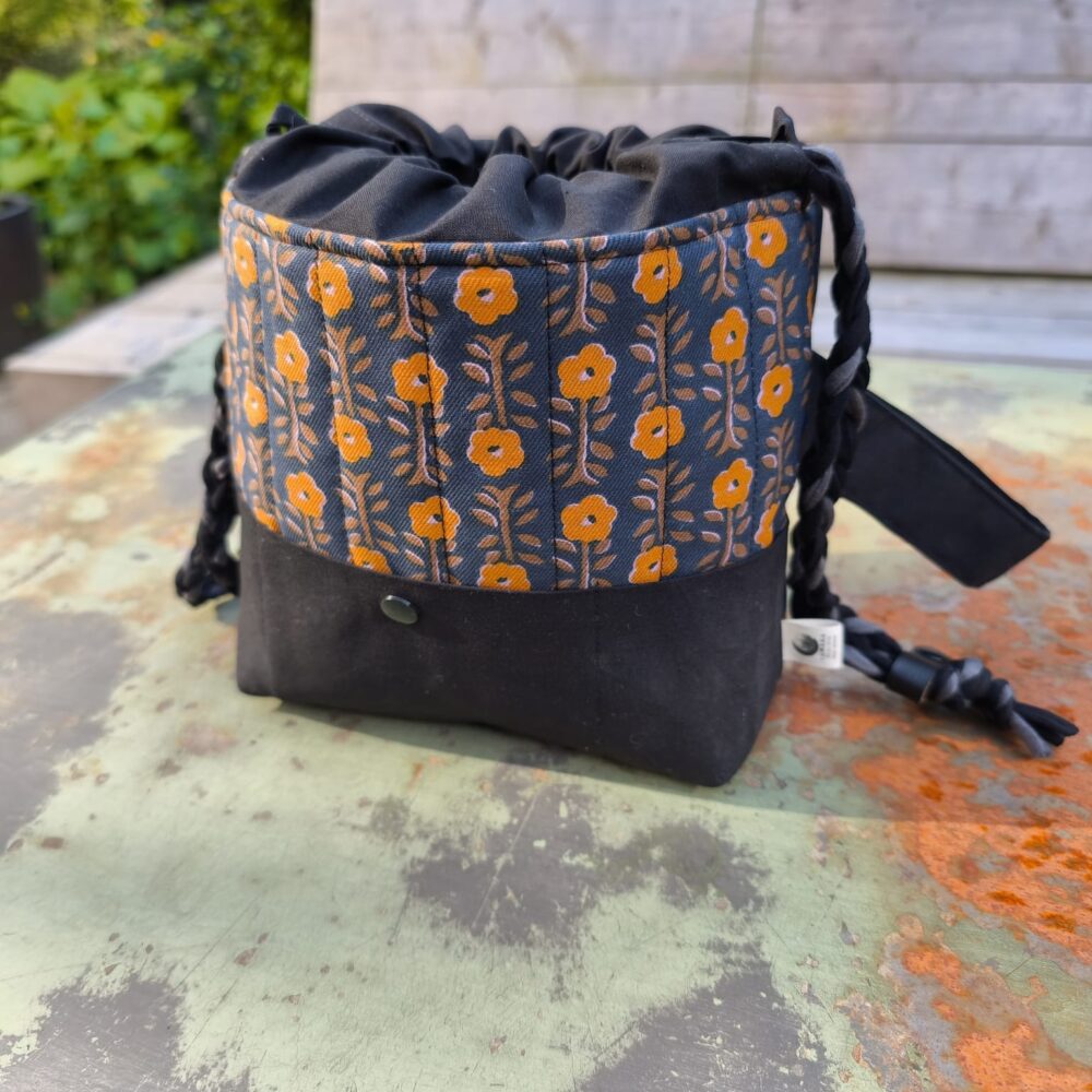 Chaque sac est cousu à la main dans le tissu de votre choix, avec une doublure assortie. Il se ferme facilement grâce à ses liens coulissants, pour garder son contenu bien protégé tout en restant accessible.